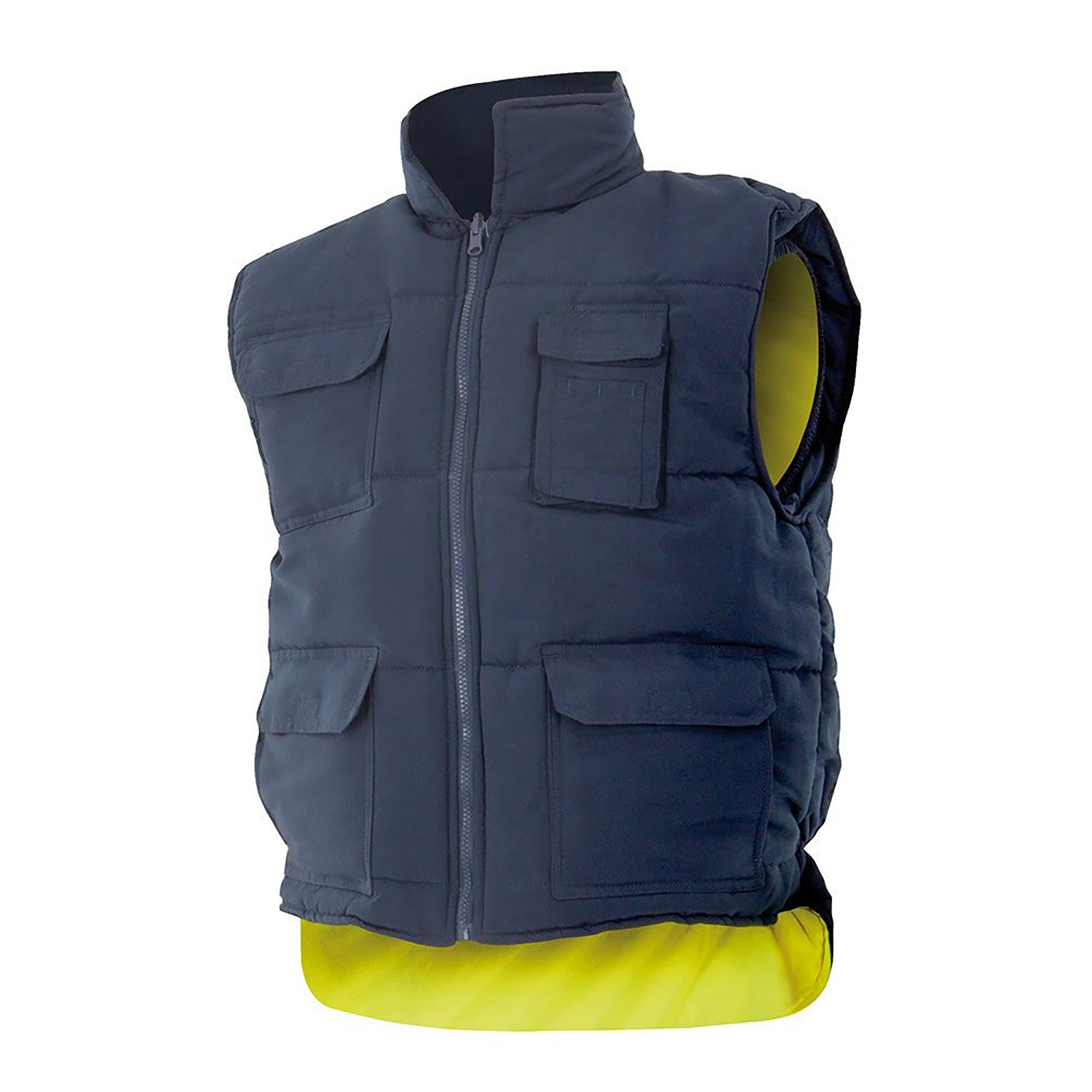 ორმხრივი, მაღალი ხილვადობის თბილი ჟილეტი მრავალი ჯიბით, იკვრება ელვა შესაკრავით.