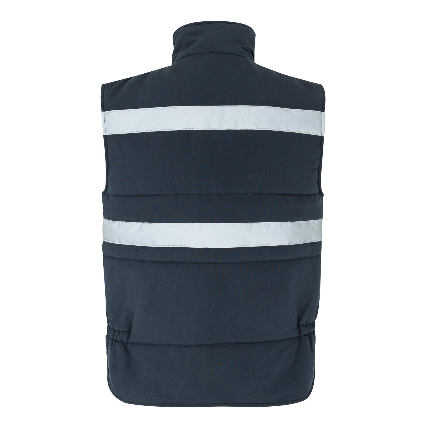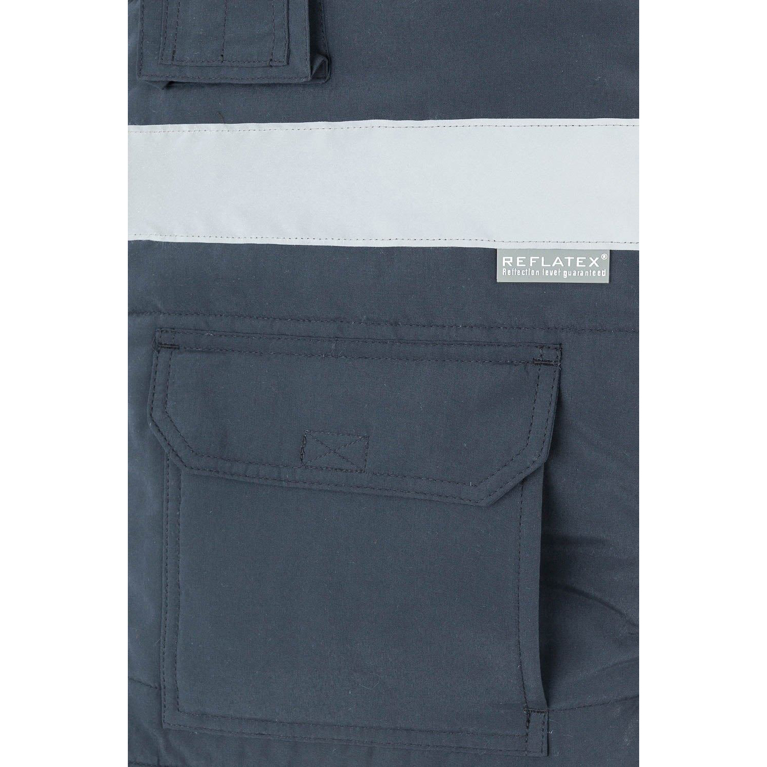 მრავალჯიბიანი ლურჯი სამუშაო ჟილეტი 2 ცალი ამრეკლი ლენტით გაუმჯობესებული ხილვადობისთვის, ცენტრალური ელვა-შესაკრავით ზემოდან საფარით, რომელიც თავის მხრივ იკვრება ღილაკებით, ქარის შემაკავებელი ჩანართებით იღლიის ადგილებთან. ჟილეტს აქვს 7 ჯიბე.