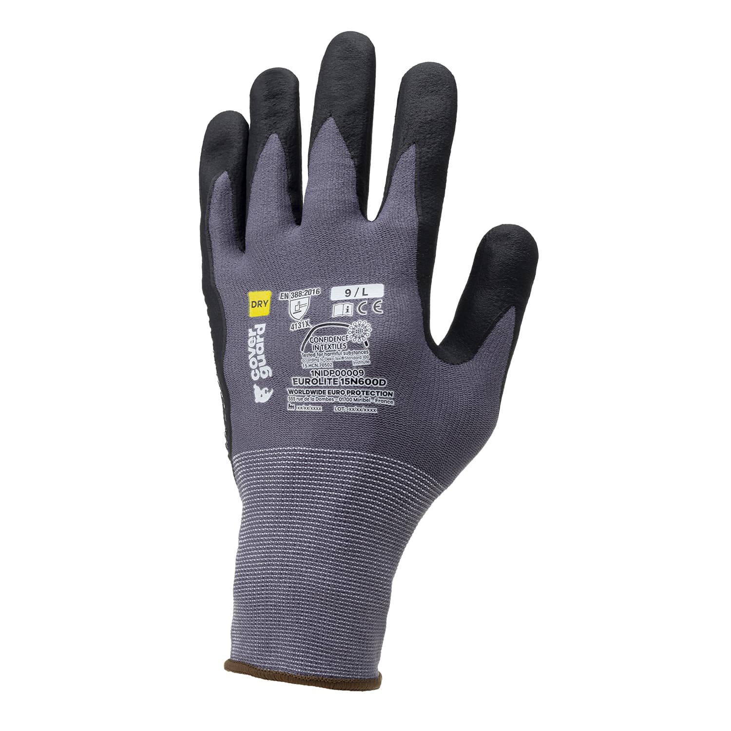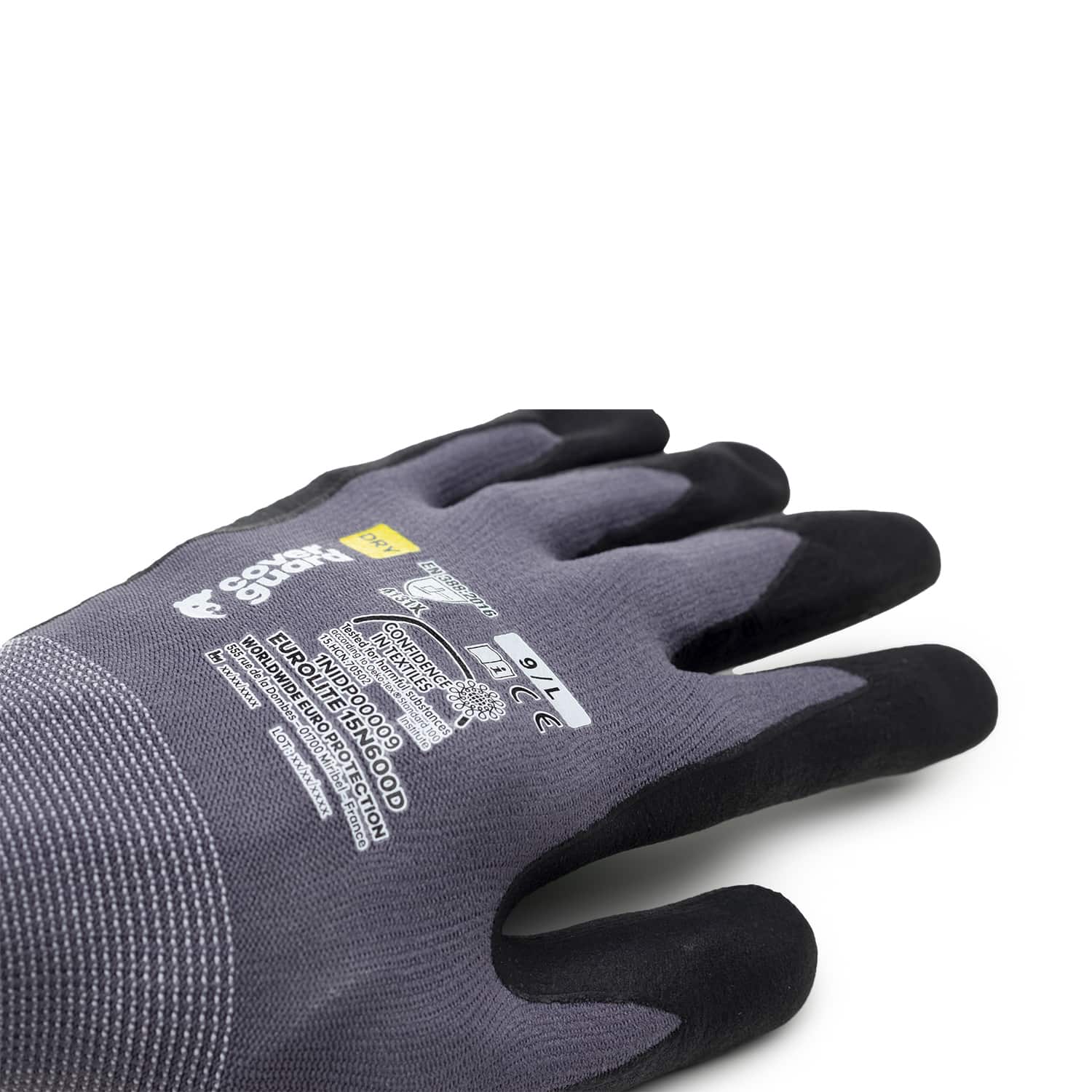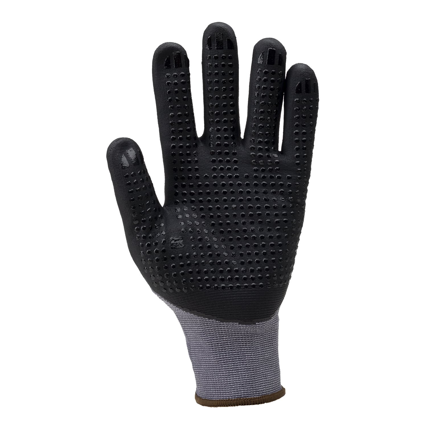 სამუშაო ხელთათმანი ნიტრილის დაფარვით და წერტილებით ხელის გულზე, მჭიდროდ ნაქსოვი მანჟეტით.