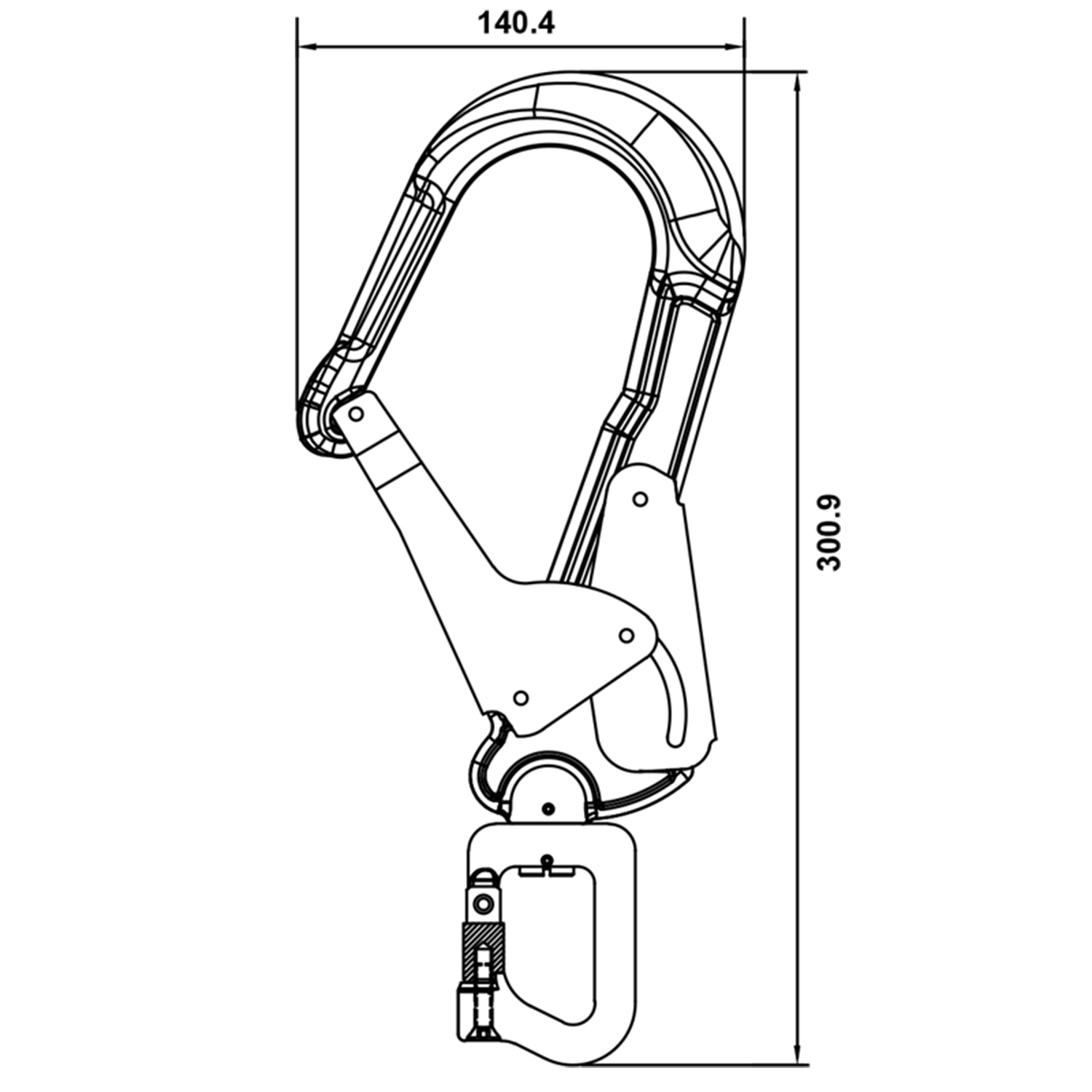 კაუჭი აღჭურვილია მბრუნავი მექანიზმით, ვარდნის ინდიკატორით და გახსნადი დასამაგრებელი თვალით, რაც უზრუნველყოფს მარტივ და უსაფრთხო შეერთებას თასმასთან.